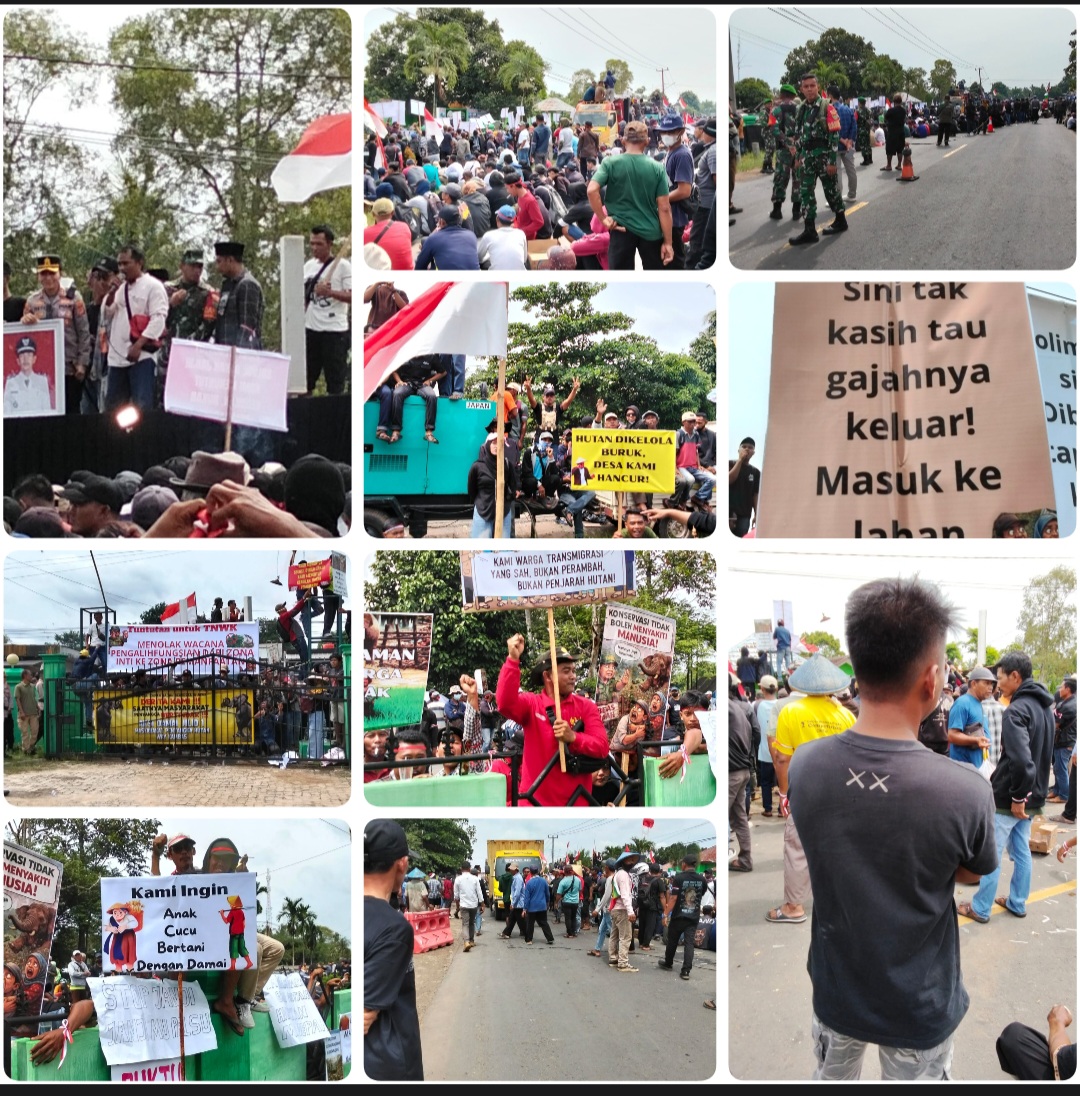 Ribuan warga dari sejumlah desa penyangga Taman Nasional Way Kambas (TNWK), Kabupaten Lampung Timur, menggelar aksi unjuk rasa di Kantor Balai TNWK, Jalan Lintas Pantai Timur Sumatera, Desa Labuhan Ratu, Selasa (13/1/2026).